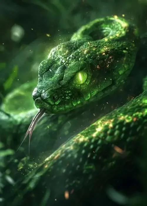 Ảnh bìa cận cảnh đầu rắn xanh đậm đang lao qua màn sương rừng, vảy phát sáng mạnh và ánh mắt khá ngầu, kiểu ảnh HD này hợp chủ đề linh xà chiêu tài lộc