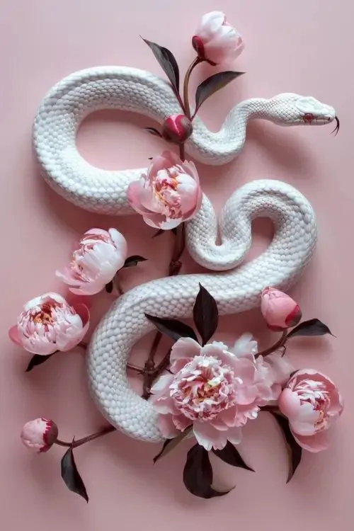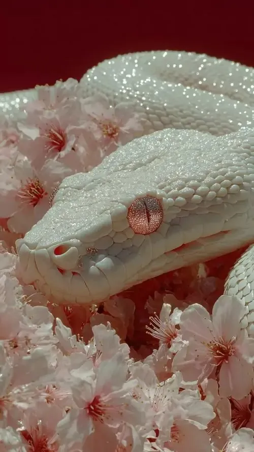 Cận cảnh đầu rắn trắng nằm trên lớp cánh hoa hồng phấn, mắt ánh hồng và vảy nổi sắc nét làm khung ảnh Ultra HD trông rất sang, hợp chủ đề may mắn và chiêu tài