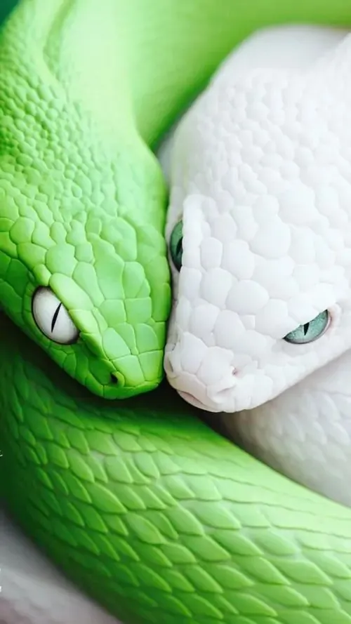 Hai con rắn xanh lá và trắng áp đầu vào nhau trong khung chụp rất gần, bề mặt vảy rõ nét khiến ảnh nền rắn thêm cuốn mắt, gợi cảm giác hòa hợp và tụ tài