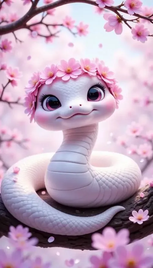 Con rắn trắng thân dày cuộn thành vòng lớn trước nền hoa đào nhạt, đầu quay nghiêng nhìn xuống tạo vẻ điềm tĩnh, rất hợp làm ảnh nền rắn cho góc màn hình cần sự bình an