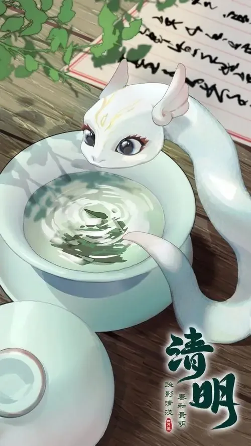 Một chú rắn trắng nhỏ ngồi trong tách trà xanh, mắt tròn hiền và bên cạnh có chữ thư pháp, cảnh này lạ mắt mà vẫn gần gũi, hợp làm hình nền điện thoại cầu bình an
