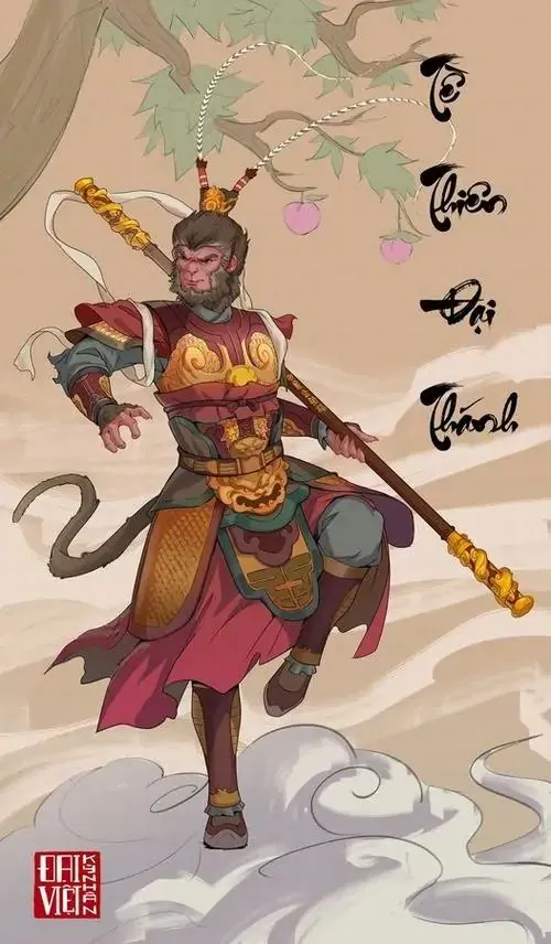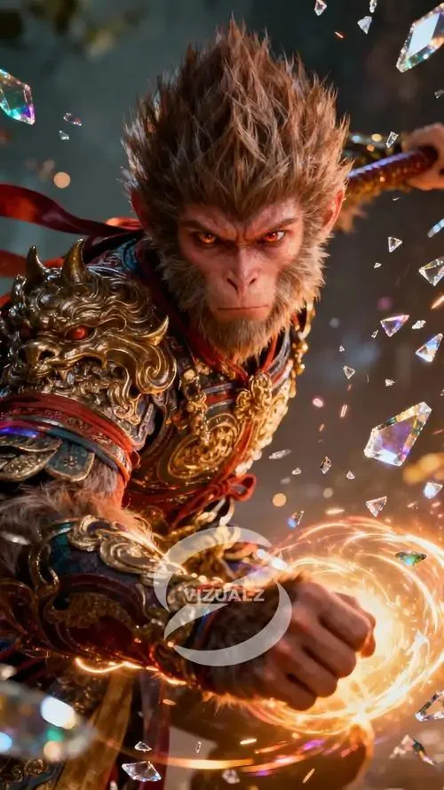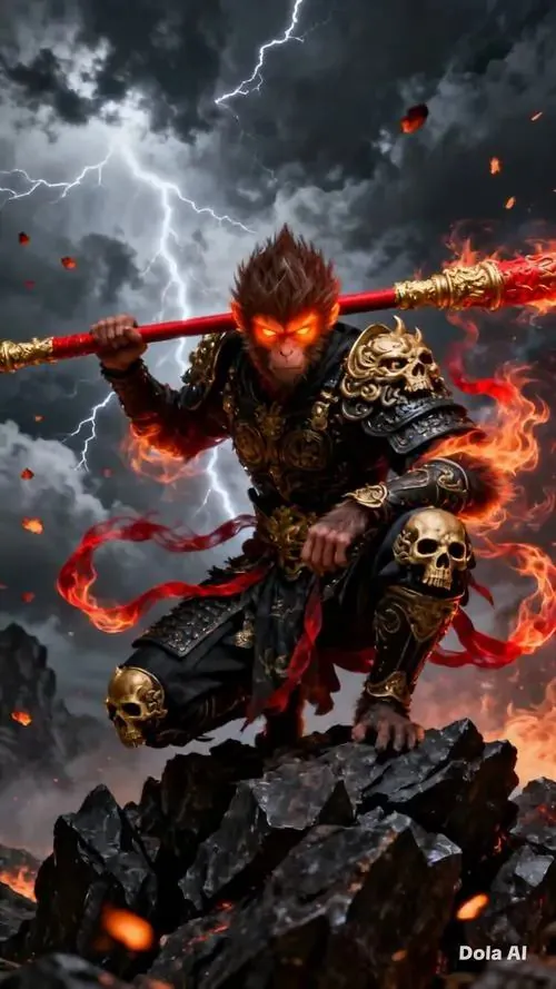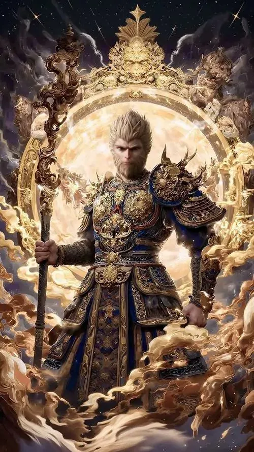 Hình nền hầu vương con khỉ mặc giáp đen viền vàng bước xuống bậc đá, mắt nhìn ngang rất chắc và bình tĩnh, ảnh HD hợp tuổi mang sắc phong thủy khá rõ