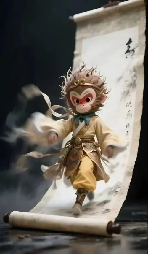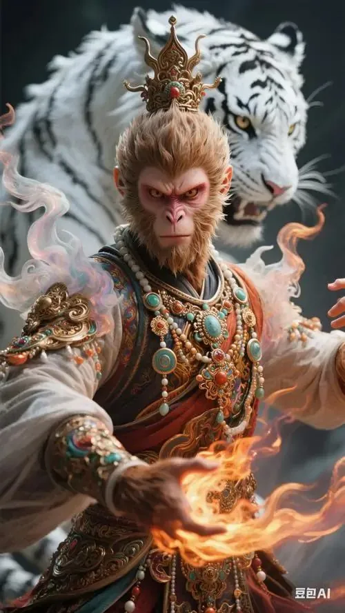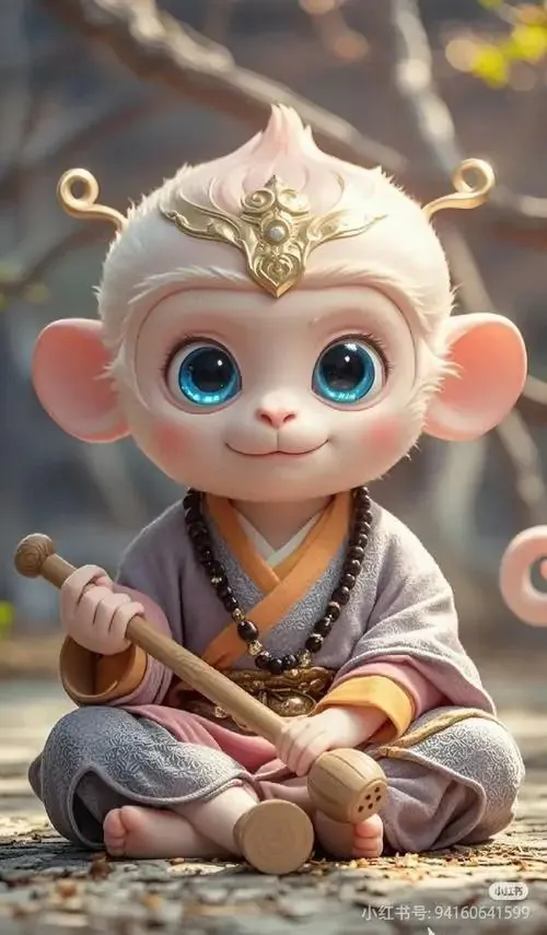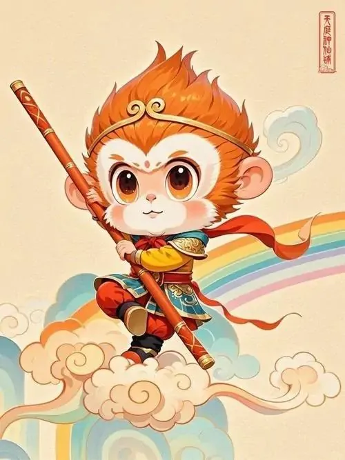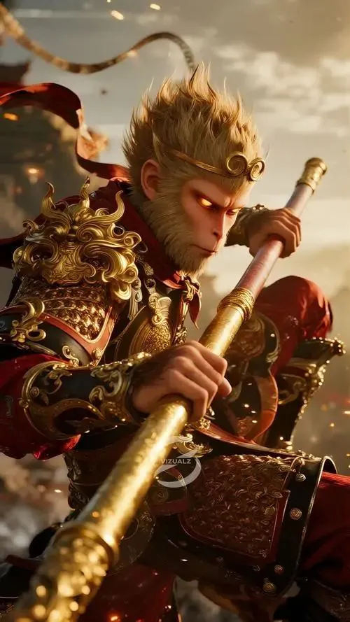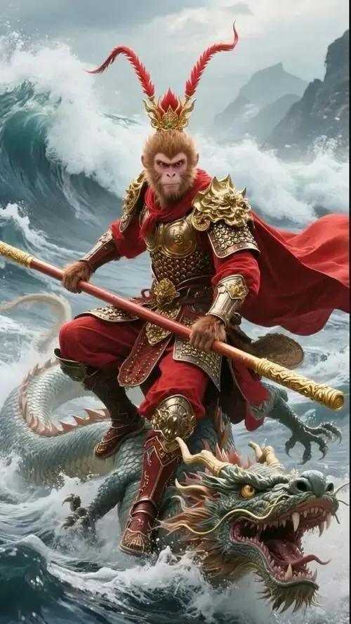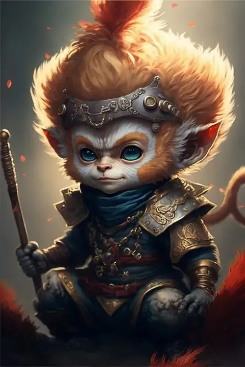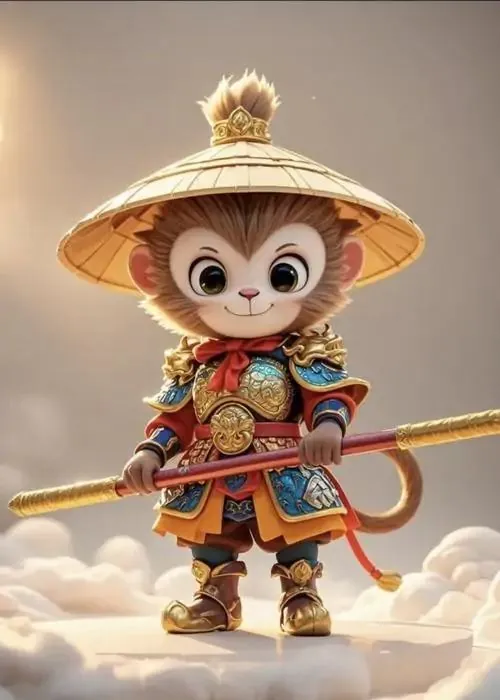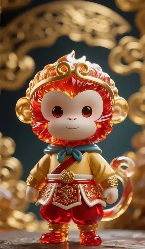 Ảnh wallpaper linh vật khỉ mặc áo bào đỏ sẫm, tay phải cầm gậy đặt chéo trước ngực và nhìn chếch lên, ảnh HD gợi cảm giác chiêu tài và giữ vận khí ổn định