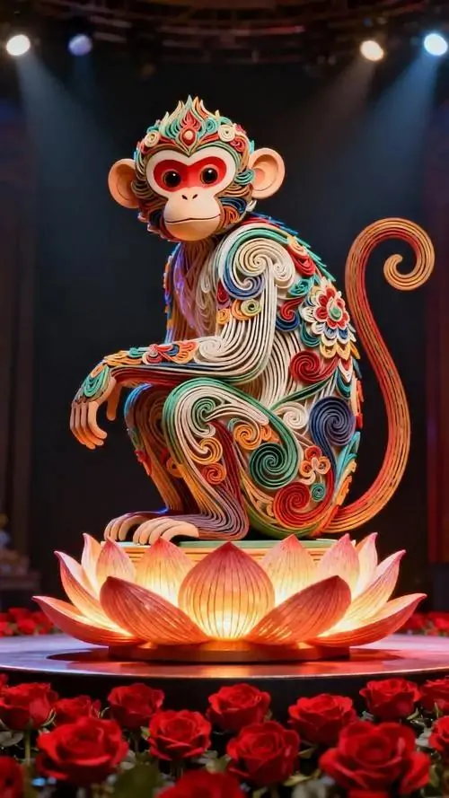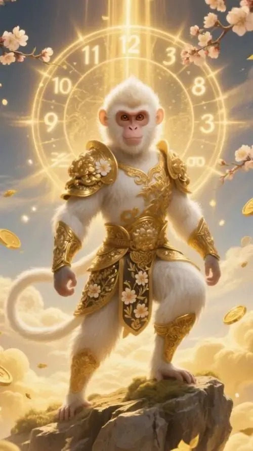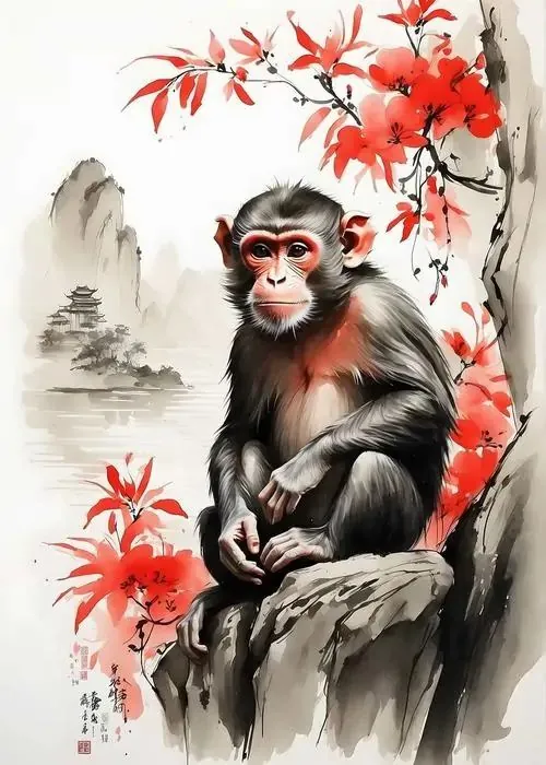 Khỉ lông bạc đứng trên mái ngói cổ, vai khoác dải lụa vàng và mặt hướng về phía Tây, hình khỉ phong thủy hợp người tuổi Thân ưu tiên hướng tốt và bản mệnh Kim
