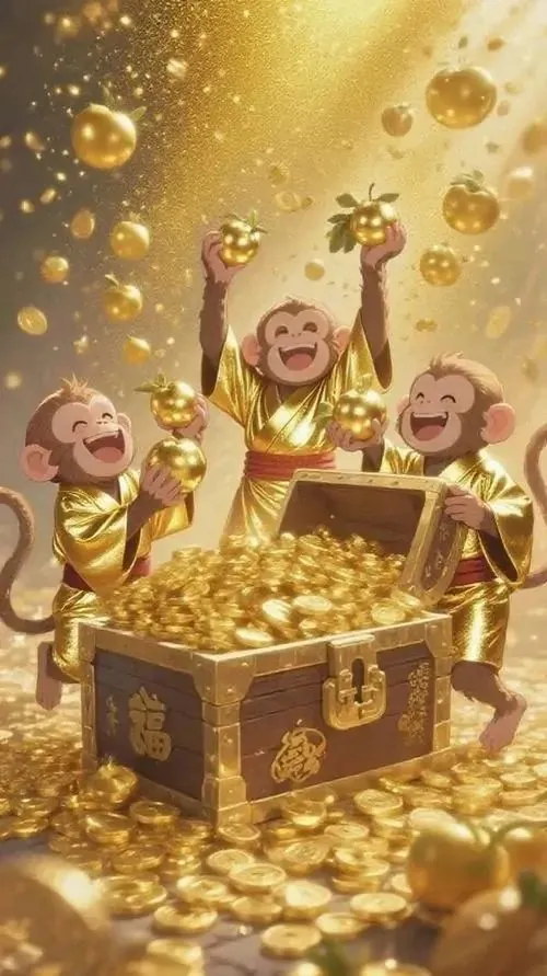 Con khỉ vàng ngồi bên chum cổ đầy tiền xu, chân buông thoải mái và vẻ mặt vui sáng, hình khỉ phong thủy này hợp tuổi để giữ tài lộc và thêm may mắn mỗi ngày