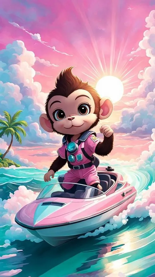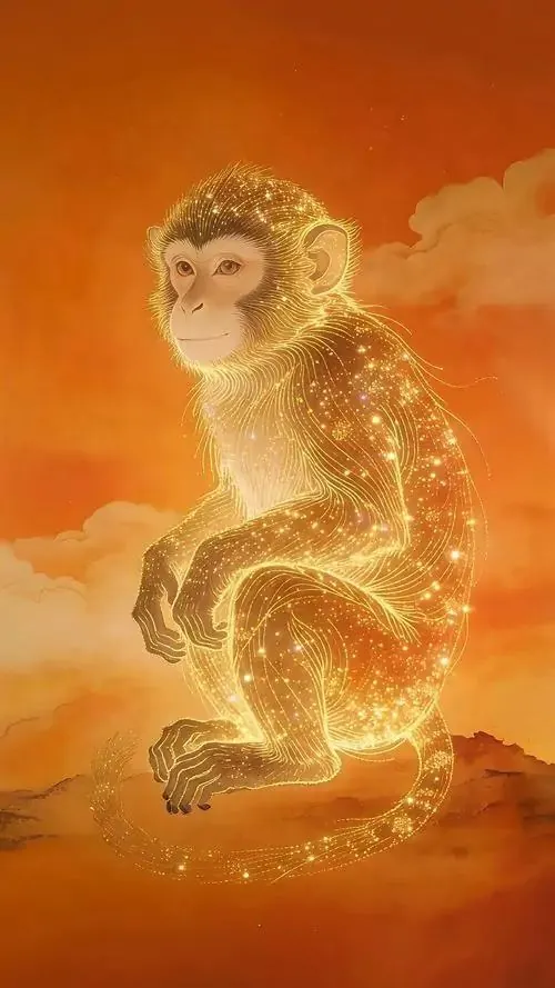 Linh vật khỉ đứng trước nền mặt trời mọc, thân xoay ba phần tư và ánh mắt đầy sinh khí, wallpaper tuổi Thân này gợi cảm giác khởi đầu thuận lợi và thịnh vượng