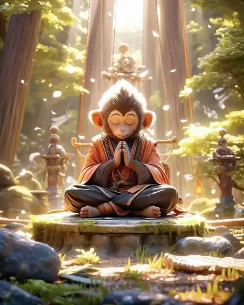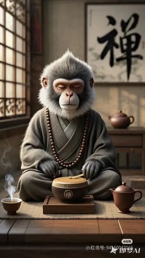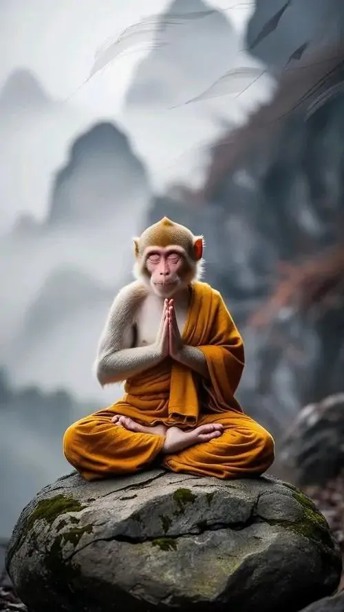 Linh vật khỉ trong áo choàng xanh xám tựa vào đá núi, mắt nhìn xuống bàn tay đang mở, ảnh nền tuổi Thân này hợp người thích sự trầm hơn nhưng vẫn chiêu tài