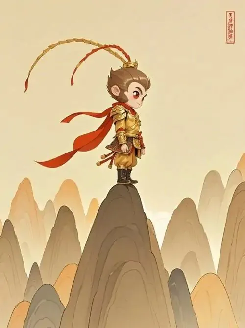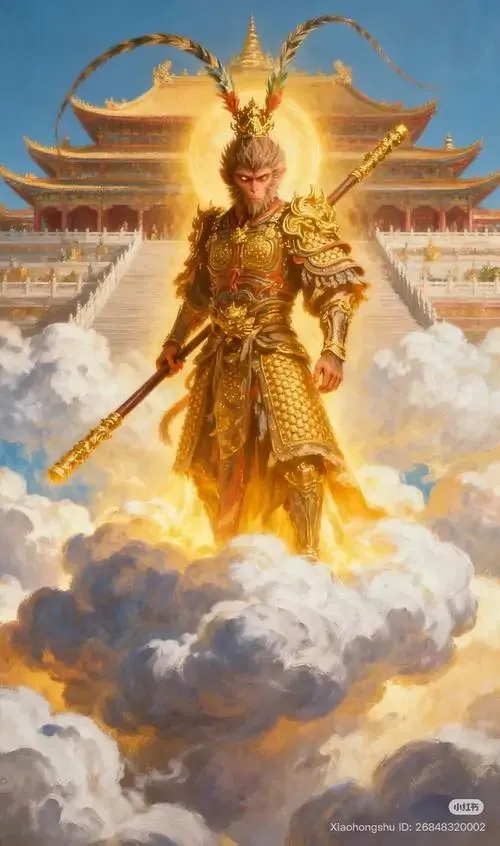 Ảnh nền khỉ vàng hầu vương khoác áo đỏ sẫm đứng trước cổng đá, gió làm tà áo bay nhẹ và mặt giữ vẻ nghiêm, ảnh HD hợp tuổi để cầu vận khí hanh thông