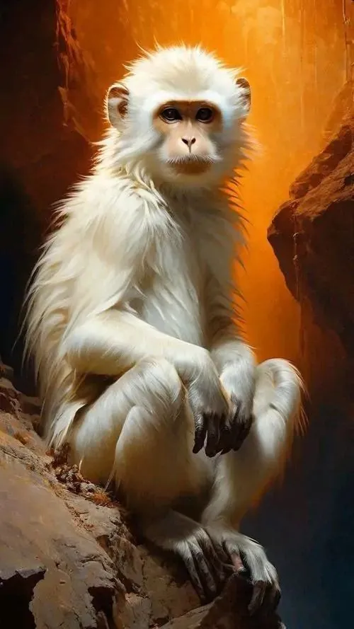 Khỉ lông xám bạc ngồi giữa nền đá trắng, mắt nhìn thẳng rất tỉnh và đuôi vòng gọn sau lưng, hình khỉ phong thủy này hợp người tuổi Thân mệnh Kim