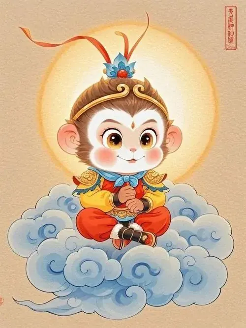 Con khỉ ôm hồ lô vàng đứng trên nền mây trắng, miệng hơi cười và ánh mắt hiền, hình nền con khỉ hợp tuổi Thân mang cảm giác thịnh vượng rất đời thường