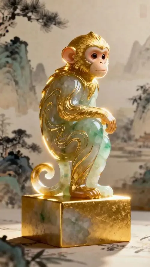 Khỉ đội vương miện vàng đứng cạnh con dấu đỏ, thân xoay nửa góc và đuôi vắt mềm phía sau, wallpaper tuổi Thân này tạo cảm giác tụ tài khá rõ khi nhìn lâu