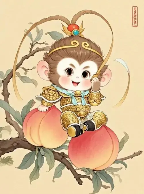 Ảnh wallpaper tuổi khỉ linh vật khỉ đứng trên nền mây bạc, mắt nhìn xuống quả đào trong tay và môi khẽ cười, bản đẹp hợp người tuổi Thân cầu chiêu tài