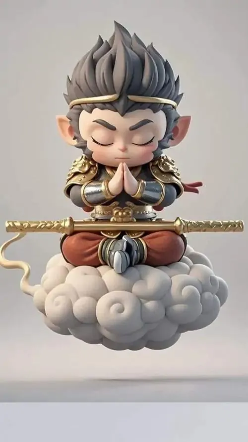 Ảnh nền tuổi Thân con khỉ mặc áo giáp bạc cưỡi mây lướt ngang khung hình, mắt sáng và tay giữ gậy chắc, ảnh 3D tạo cảm giác mạnh nhưng vẫn giữ phong thủy