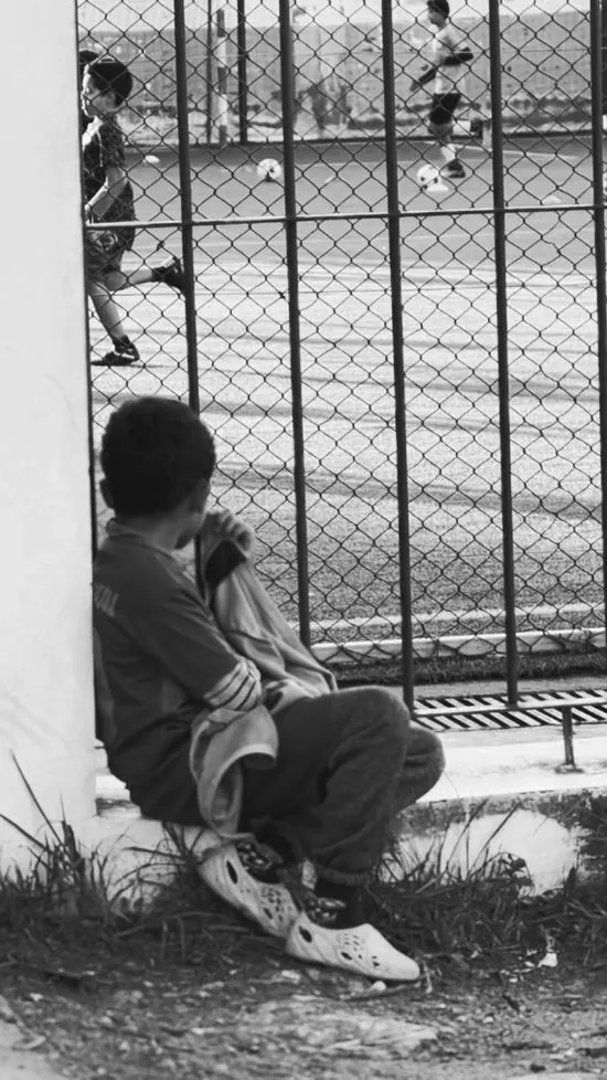 Ảnh wallpaper đen trắng về một cậu bé ngồi lặng lẽ bên hàng rào gợi nhắc niềm đam mê túc cầu cháy bỏng với độ sâu trường ảnh đầy tâm trạng.