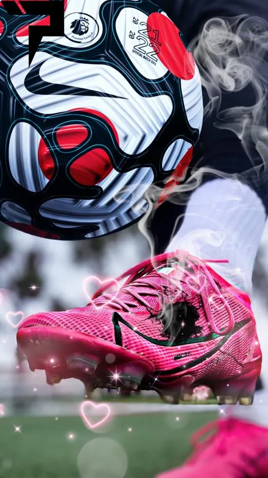 Hình nền bóng đá sắc nét đặc tả đôi giày thi đấu màu hồng rực rỡ đặt cạnh trái bóng tròn trên mặt cỏ xanh mướt cho thấy mật độ điểm ảnh cực lớn.
