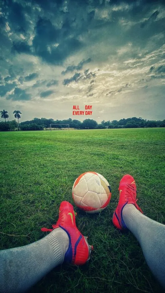 Đôi chân cầu thủ đứng vững chãi bên quả bóng giữa không gian sân cỏ trải dài đến tận chân trời gợi lên niềm đam mê bóng đá không bao giờ tắt.