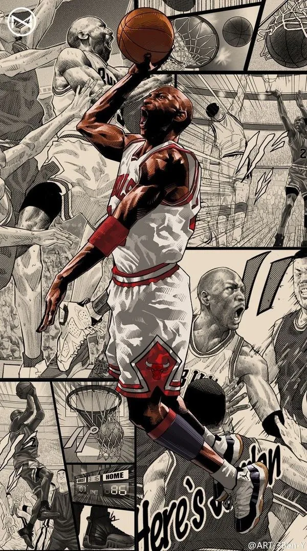 Cầu thủ thực hiện cú bay người úp rổ đầy dũng mãnh trên nền các bản vẽ chì phác họa lại những khoảnh khắc thi đấu lịch sử đầy ấn tượng.