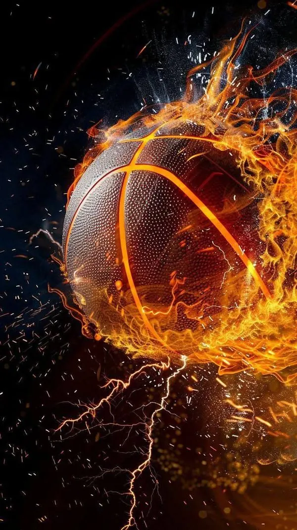 Ảnh wallpaper quả bóng rổ đang bùng cháy dữ dội giữa cơn mưa tia sét tạo nên một bối cảnh thi đấu đầy khốc liệt và mang đậm tính trình diễn.