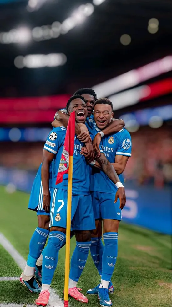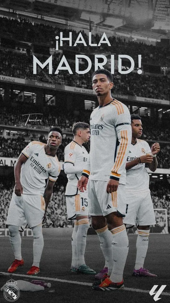 Tấm Tấm ảnh nền dàn sao áo trắng đứng nghiêm trang dưới dòng chữ Hala Madrid đầy kiêu hãnh thể hiện tinh thần đội nhóm gắn kết bền chặt và mãnh liệt.