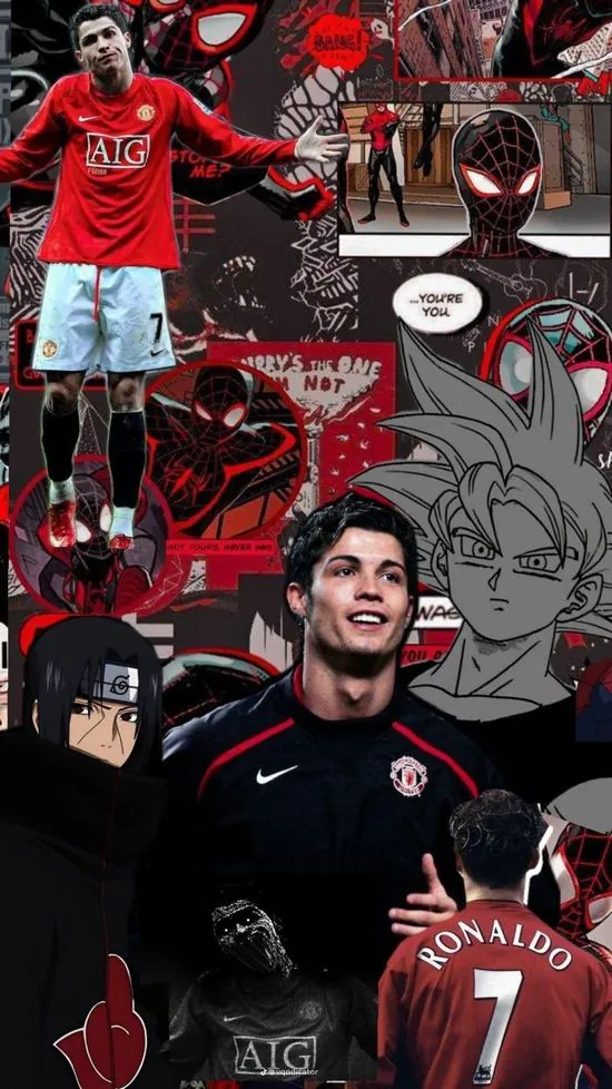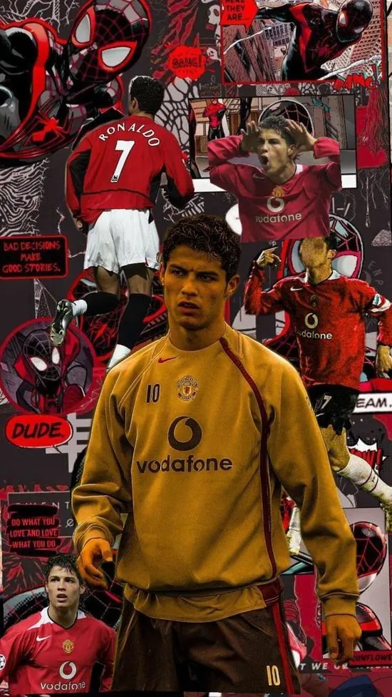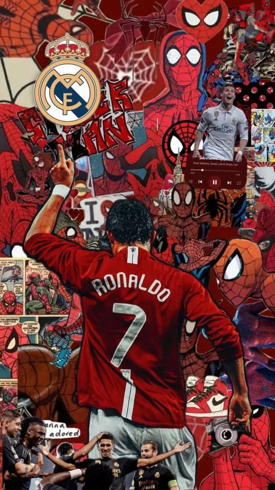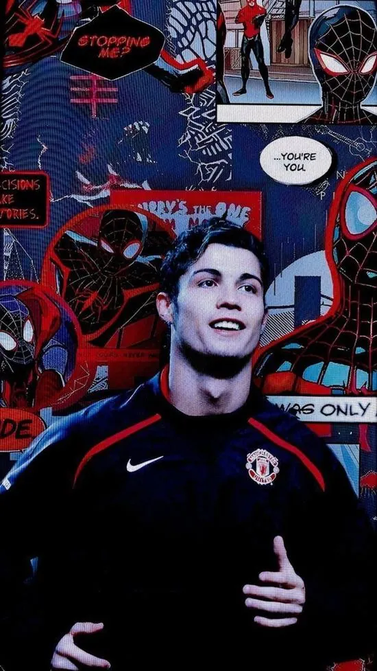Hình màn hình phối giữa hình ảnh Ronaldo và người nhện trên tông đỏ rực rỡ tạo nên hiệu ứng thị giác độc lạ cho những fan yêu thích sự phá cách.