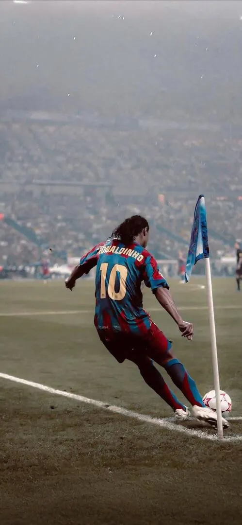 Hình ảnh nền Ronaldinho với nụ cười rạng rỡ đặc trưng khi khoác lên mình chiếc áo sọc đỏ đen mang lại sự vui vẻ và cảm hứng chơi bóng thuần khiết.