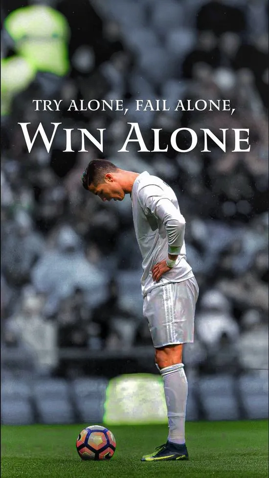 Ảnh wallpaper Ronaldo quay lưng bước đi cùng trích dẫn đầy cảm hứng trên nền xanh lá làm hiện rõ cá tính biểu tượng của một người dẫn đầu vĩ đại.