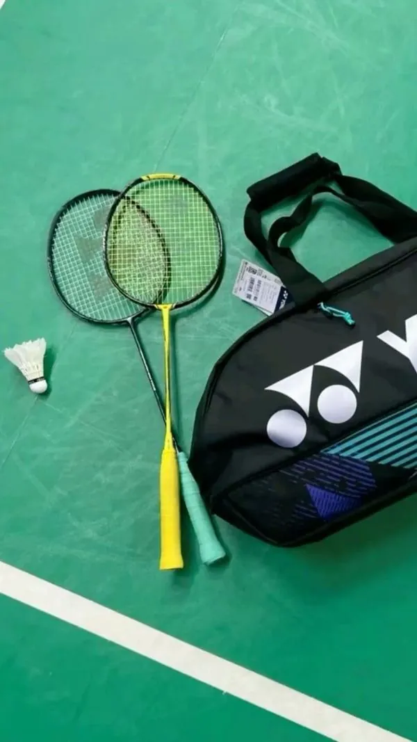 Hai chiếc vợt cầu lông nằm cạnh nhau trên mặt thảm sân xanh mướt dưới ánh đèn sân vận động tạo nên một không gian thi đấu chân thực nhất.